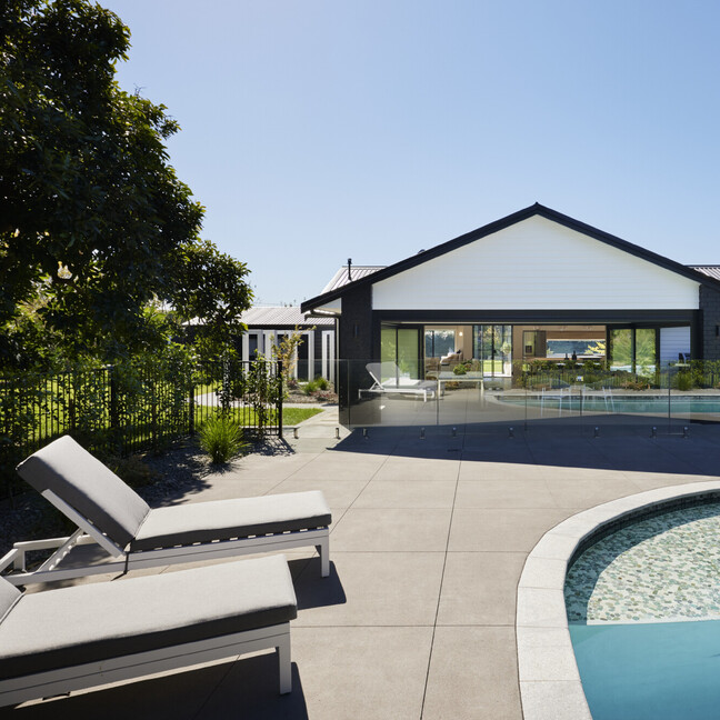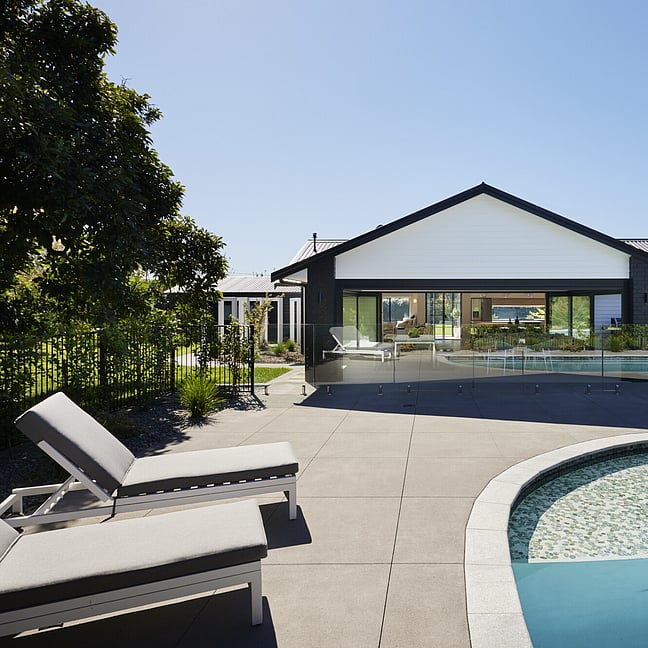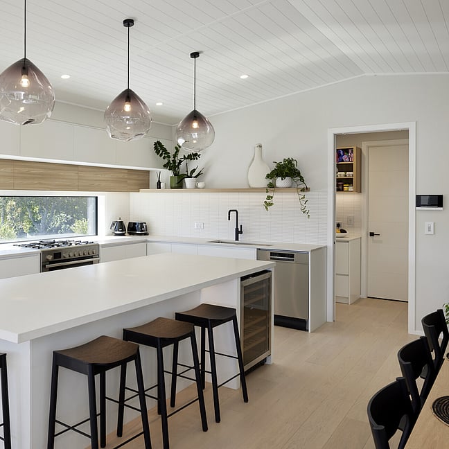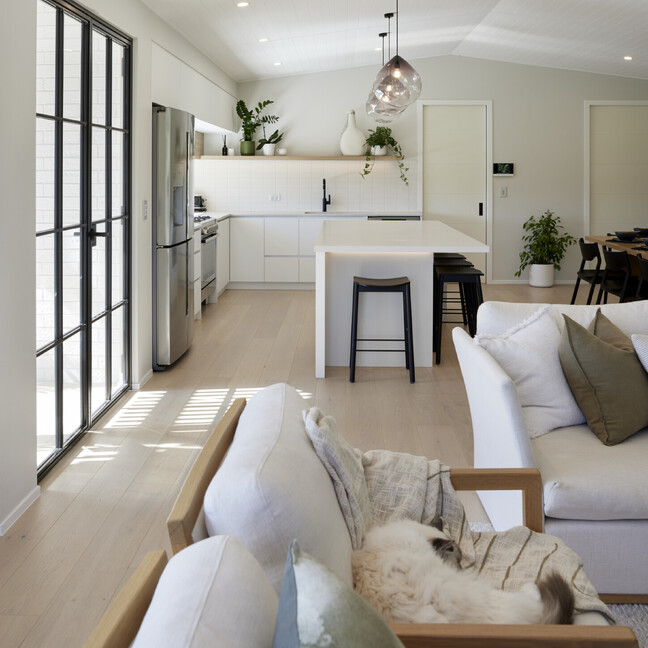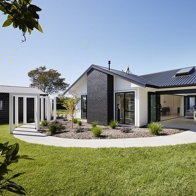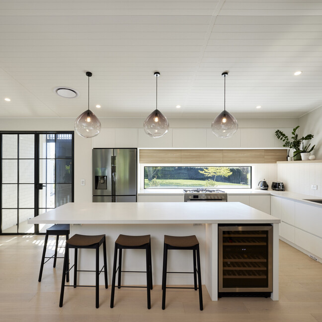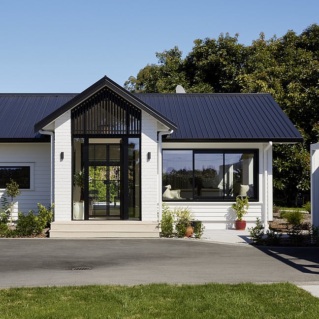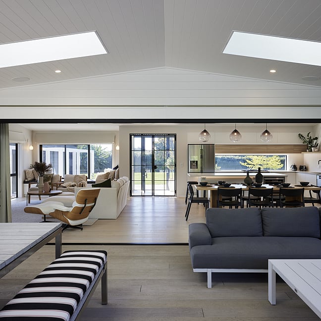 For clients living in semi-rural Te Puna on an idyllic, lifestyle sized property, the addition of a significant extension has substantially increased the original footprint to transform and create an expansive single level family home. With an exterior now rendered in the classic combination of crisp white weatherboards against a black long-run roof, black joinery and black painted brickwork, the new addition blends seamlessly with the existing building.