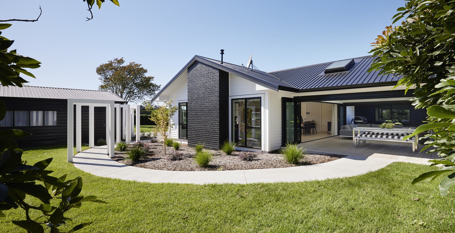 For clients living in semi-rural Te Puna on an idyllic, lifestyle sized property, the addition of a significant extension has substantially increased the original footprint to transform and create an expansive single level family home. With an exterior now rendered in the classic combination of crisp white weatherboards against a black long-run roof, black joinery and black painted brickwork, the new addition blends seamlessly with the existing building.