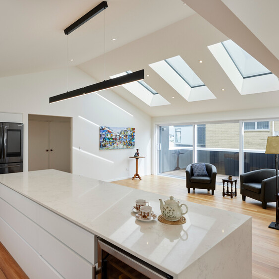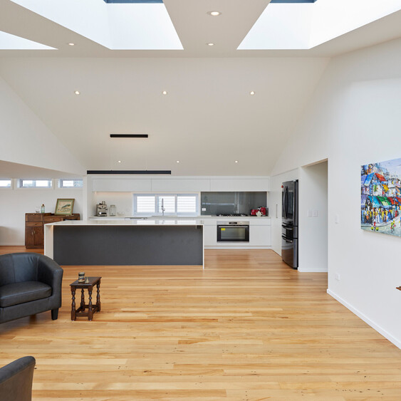 Except for the existing bathrooms, our team worked on every part of this home, inside and out – from the new roof, gutters and spouting to the new fence. Crisp white double glazed joinery contrasts against sharp black weatherboard, replacing tired cladding and improving structural integrity and durability against salt laden sea breezes.