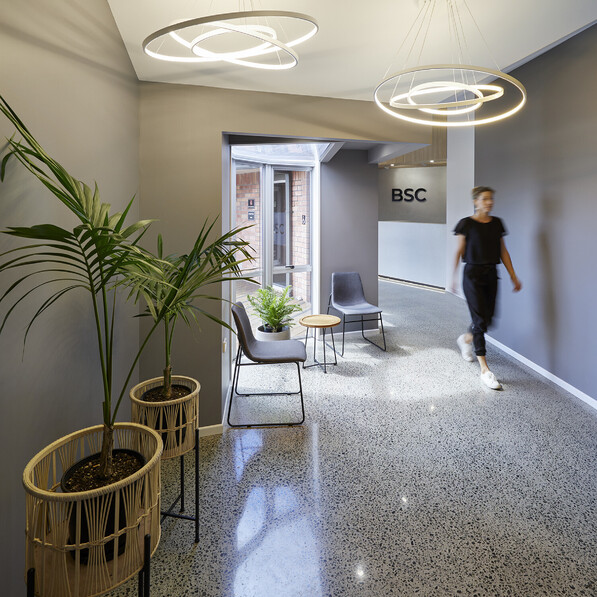 The original kitchen/living areas have been stripped out and replaced with a spacious client meeting room, staff room with facilities and a wide and inviting reception foyer. Concrete floors and a venetian polished plaster feature wall is warmed by detailed timber panelled walls and stylish LED lighting creating an upscale, sleek interior, while a 'living' wall of potted plants enhances the welcoming ambience.