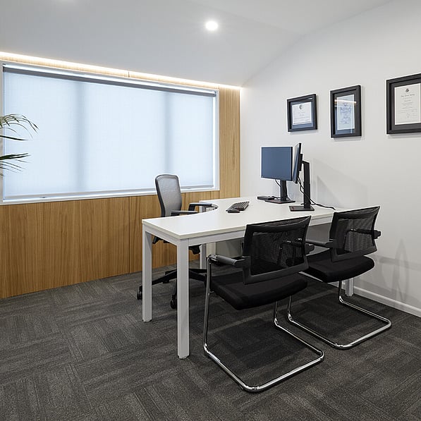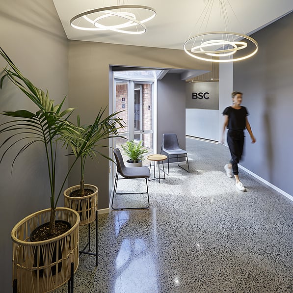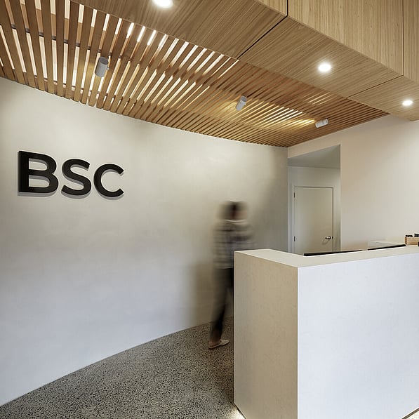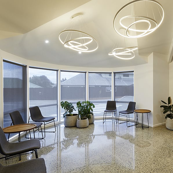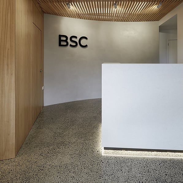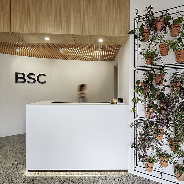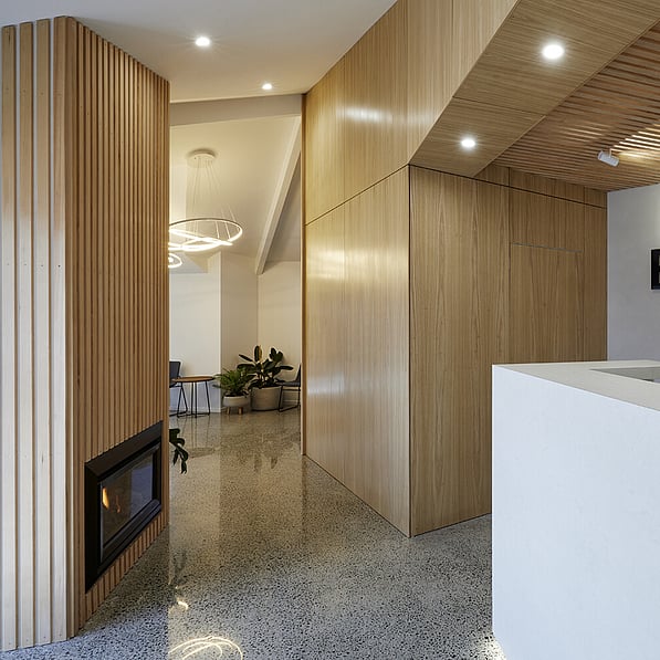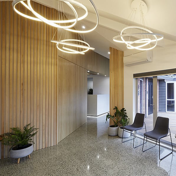 The original kitchen/living areas have been stripped out and replaced with a spacious client meeting room, staff room with facilities and a wide and inviting reception foyer. Concrete floors and a venetian polished plaster feature wall is warmed by detailed timber panelled walls and stylish LED lighting creating an upscale, sleek interior, while a 'living' wall of potted plants enhances the welcoming ambience.